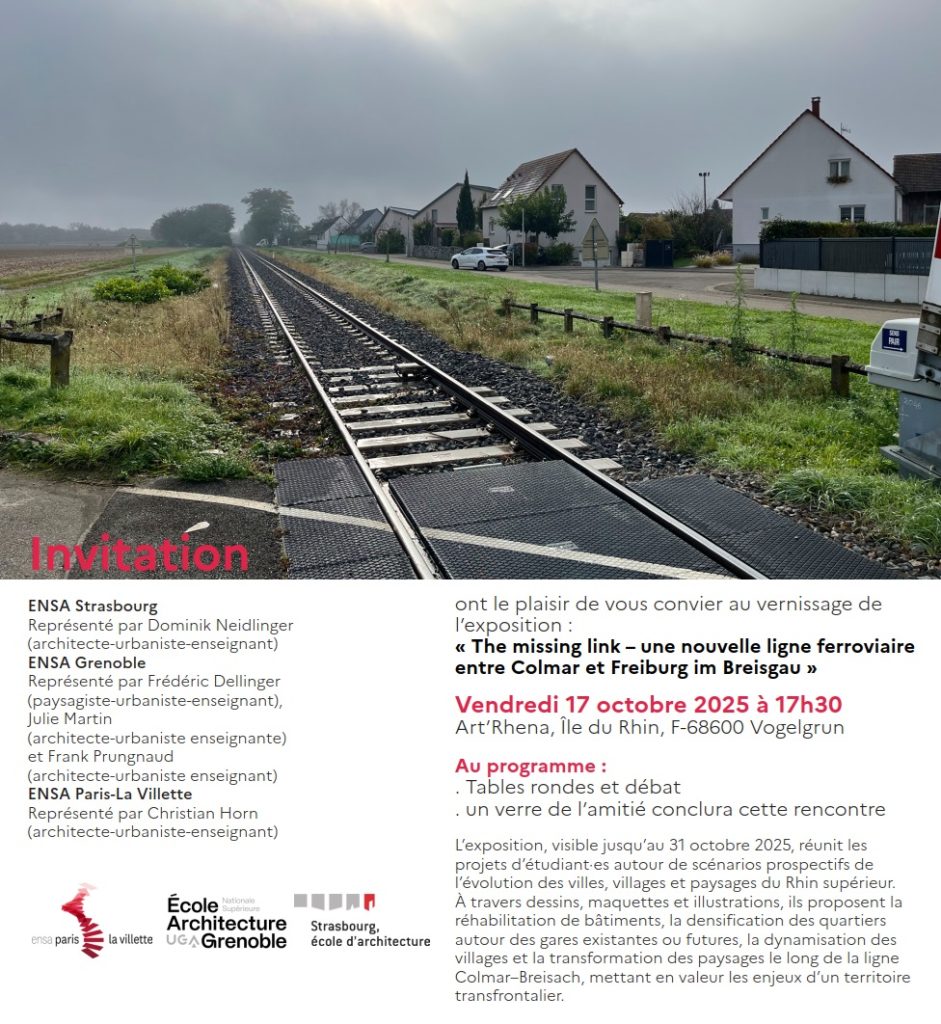Dans le cadre de leur dernière année de Master, des étudiants des écoles nationales d’architecture de Strasbourg, de Grenoble et de Paris La Villette, ont travaillé sur des scénarios prospectifs de l’évolution des villes et du paysage le long de la ligne ferroviaire Colmar-Breisach. Cet atelier d’architecture s’inscrit en complément de l’étude sur la réouverture au trafic passager à moyen/long terme de cette ligne qui est considérée par la Commission Européenne comme un « maillon manquant » du système ferroviaire transfrontalier.